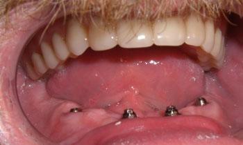 This patient was looking for reliable tooth replacement and decided on "All-on-4" denture restoration. The dentures fit securely over four dental implants to restore natural function and appearance. The implants make it so the denture is screwed on tightly, which prevents movement.